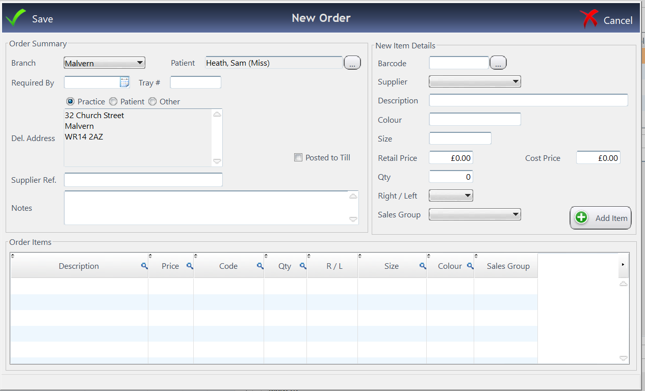 When complete, press Add Item. Added items will then appear in the bottom part of the screen. Press Save when complete. Back on the Orders screen, right-click and choose Post Order to Till.