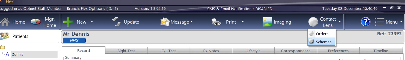 To set up a Scheme, click to Contact Lens - Schemes on the Patient Record homepage (shown below).