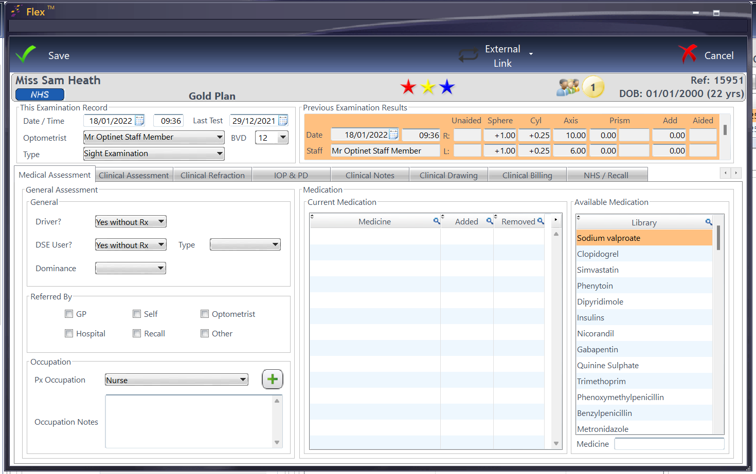 The start of the Examination is the Medical Assessment tab. An overview of the record and of the Previous Examination Result (if applicable) are shown towards the top of the screen. Press View Previous to open these up in a new window.