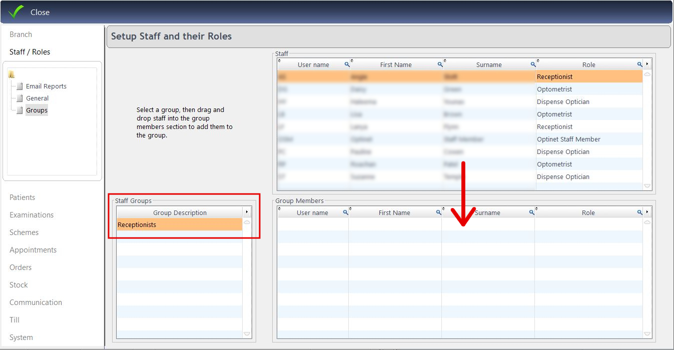 First, you can create a group in the Staff Groups box by clicking on the next empty line twice and then typing in the name of the group. Then, drag the required staff members from the Staff box to the Group Members box. Tip: Hold down the CTRL key to select multiple staff.
