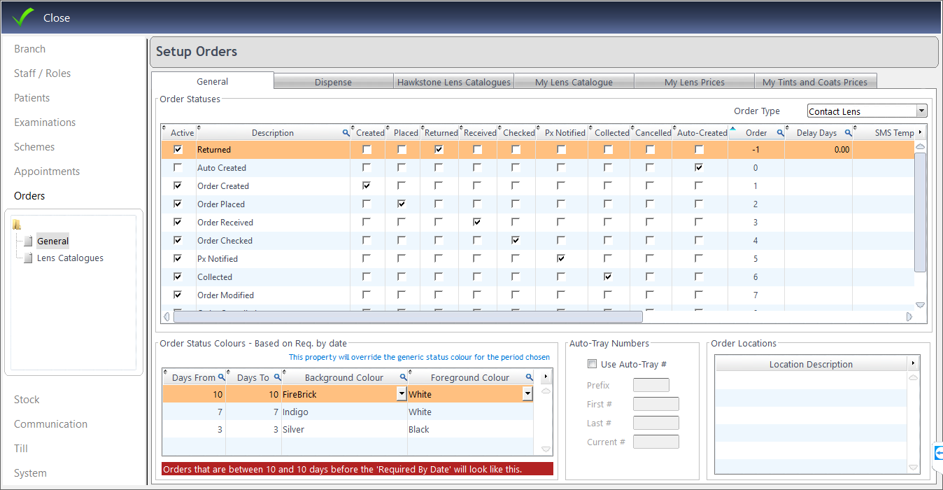 Within the first tab of this screen, the order statuses can be customised. These are shown in the Order Progress (WIP) of the Orders screen, and can be updated by the staff as the order progresses through the practice. You can set these by Order Type - Spectacle, Contact Lens or Custom (i.e. Repair).