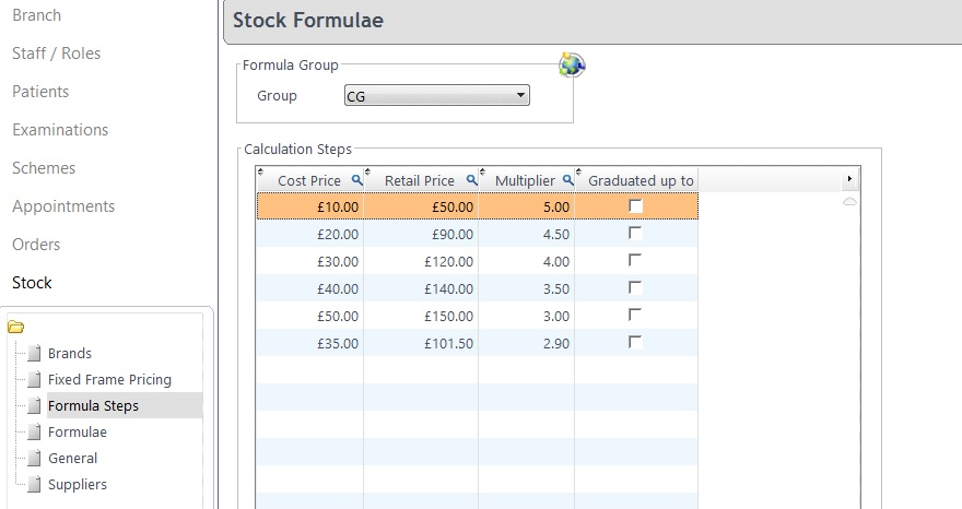 Use the Graduated up to tick box for prices to graduate up respectively. For example, a frame with a cost price of £19.99 may fall in to a different band and have a radically different retail price to a frame that cost £20.15. Having this box ticked puts a graduated price line through the formula. The image below demonstrates this.
