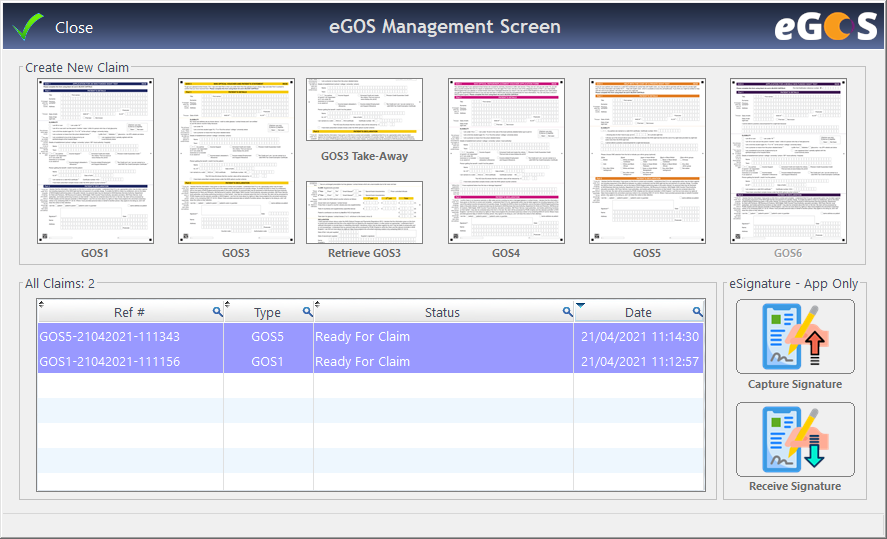 The eGOS management window is available at the top-right of the Patient Record. It has an updated design layout with images on buttons to make it easier to see which claim is being created. The screen is shown below.