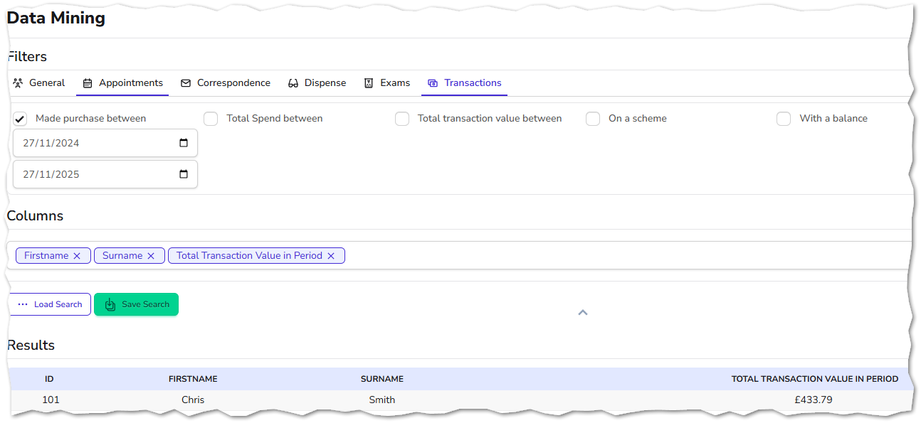 | 5881 | Data Mining | Two new fields have been added to data mining, Total Spend in Period and Total Transaction Value in Period. They should be used in conjunction with 'Made Purchase Between' to limit the totals to only count between the start and end dates.![]() | ||