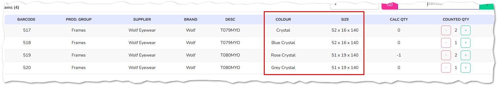 | 5919 | Stock Take | The frame colour & size have been added to the stock take screen.![]() | ||