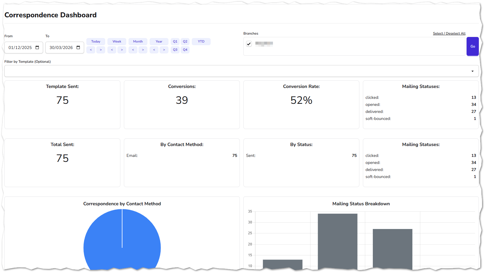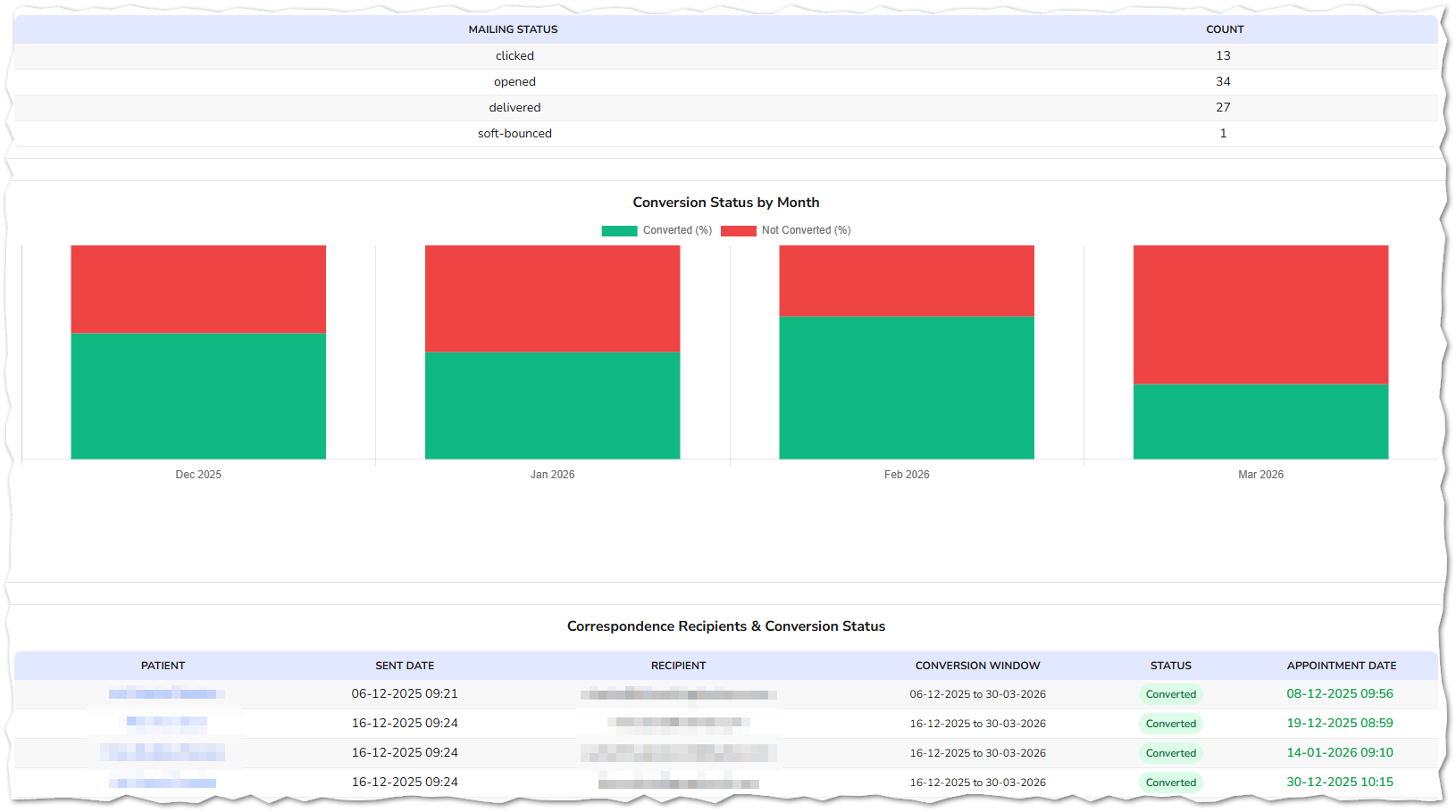 | 6198 | Dashboards | A Correspondence dashboard has been added. If a specific template is selected (i.e. a recall template) then conversion analysis is calculated and a list of patients generated showing whether the px booked an appointment or not within the conversion window. If no template is selected then basic analysis figures are displayed:
